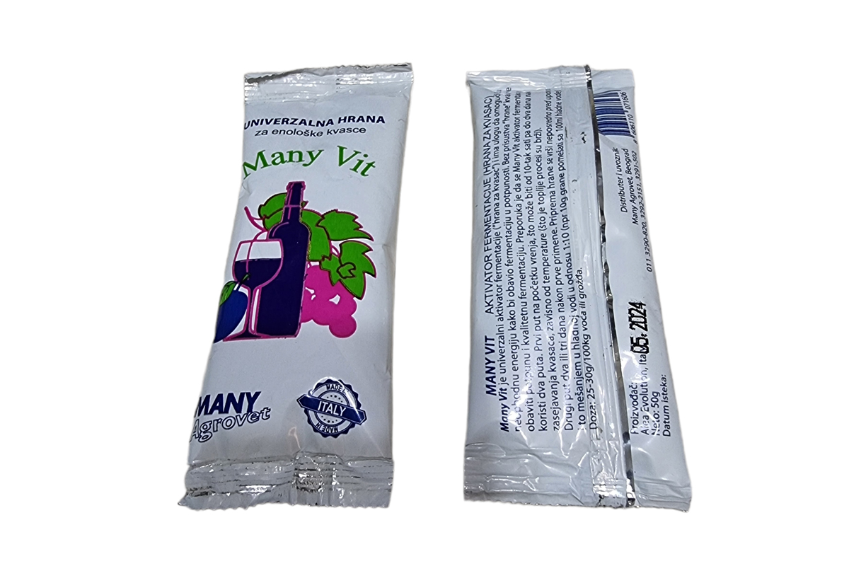 Many Vit je univerzalni aktivator fermentacije (“hrana za kvasac”) i ima ulogu da omogući kvascu neophodnu energiju kako bi obavio fermentaciju u potpunosti. Bez prisustva “hrane” kvasac neće obaviti potpunu i kvalitetnu fermentaciju.Preporuka je da se Many Vit aktivator fermentacije koristi dva puta. Prvi put na početku vrenja, što može biti od 10tak sati pa do dva dana nakon zasejavanja kvasca,zavisno od temperature (što je toplije procesi su brži). Drugi put dva ili tri dana nakon prve primene.