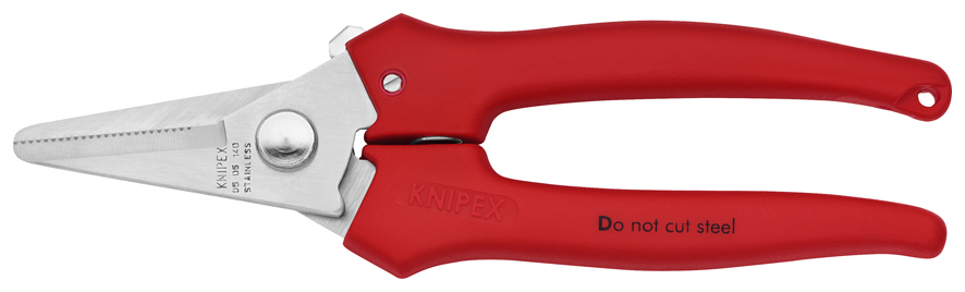 95 05 140 Kombinovane makaze Za sečenje kartona, plastike, aluminijumumske, mesing i bakarne folije. Nisu pogodne za sečenje čeličnih žica ili gvozdenih limova. Precizno brušene, kaljene oštrice. Sa oprugom za otvaranje i mehanizmom brave. štitnik sprečava prignječenje prstiju. Podesivi vijčani zglob.