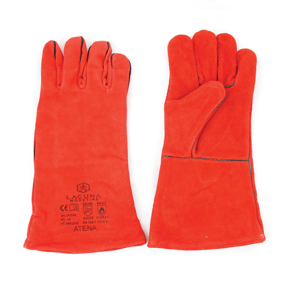 Opis: Varilačka rukavica od goveđe špalt kože s pojačanjima na palcu te vrhovima prstiju; Dlan: goveđa špalt koža; Nadlanica: goveđa špalt koža; Manžetna: goveđa špalt koža; Podstava: pamučna podstava; Standard: EN 420; EN 388 (3222X), EN 407 (413X4X); EN 12477 (TYPE A) Dostupne veličine: 10; Pakovanje: 12/72; Kontakt na toplotu: 100°C; ### Description: Welder glove made of cow split leather, welted fingers and thumb; Palm: cow split leather; Back: cow split leather; Cuff: cow split leather; Lining: cotton lining; Standard: EN 420; EN 388 (3222X), EN 407 (413X4X); EN 12477 (TYPE A); Available sizes: 10; Original packing: 12/72; Contact heat; °C